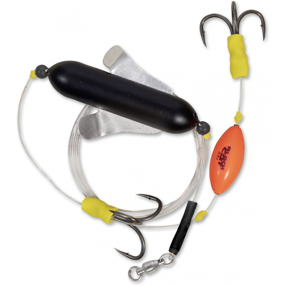 Por lo tanto, se beneficiará de un Winged U-Float que puede moverse libremente y crear un remolino muy atractivo justo encima del señuelo. Dos anzuelos triples de tamaño 2/0 están colocados uno detrás del otro y están conectados al cebo.